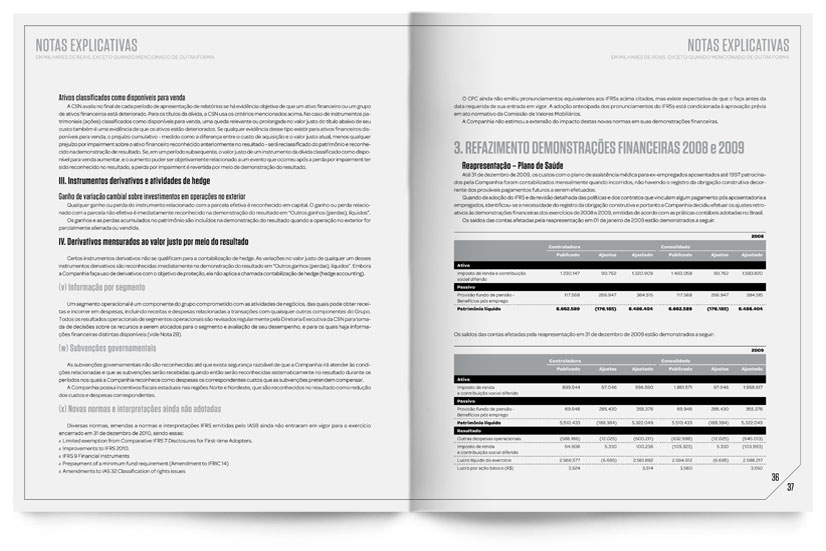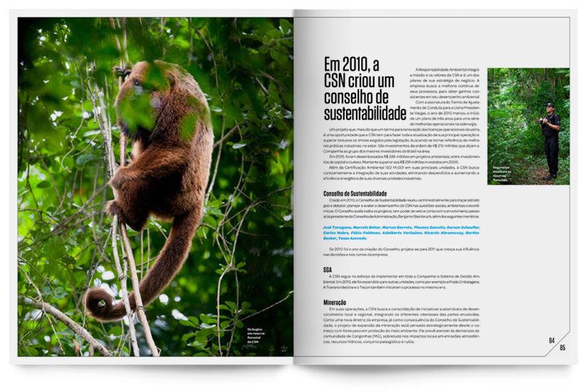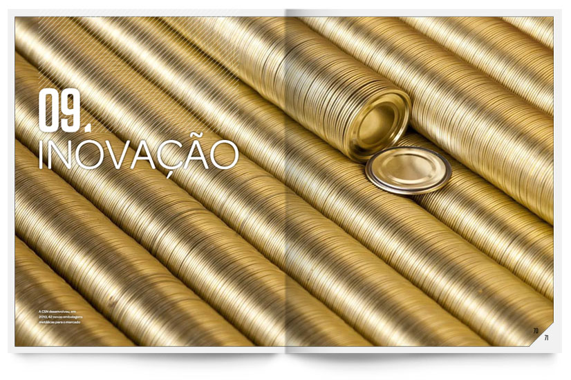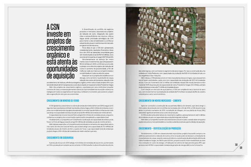Para o relatório anual de 2010, da Companhia Siderúrgica Nacional chamou a Casa36 para coordenar toda o projeto gráfico e direção de arte. Cuidamos da produção das fotos, nas diversas plantas da empresa, e fizemos a diagramação de todo o conteúdo.