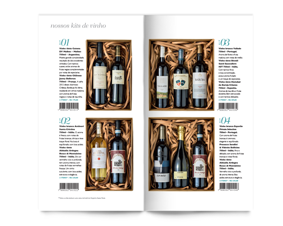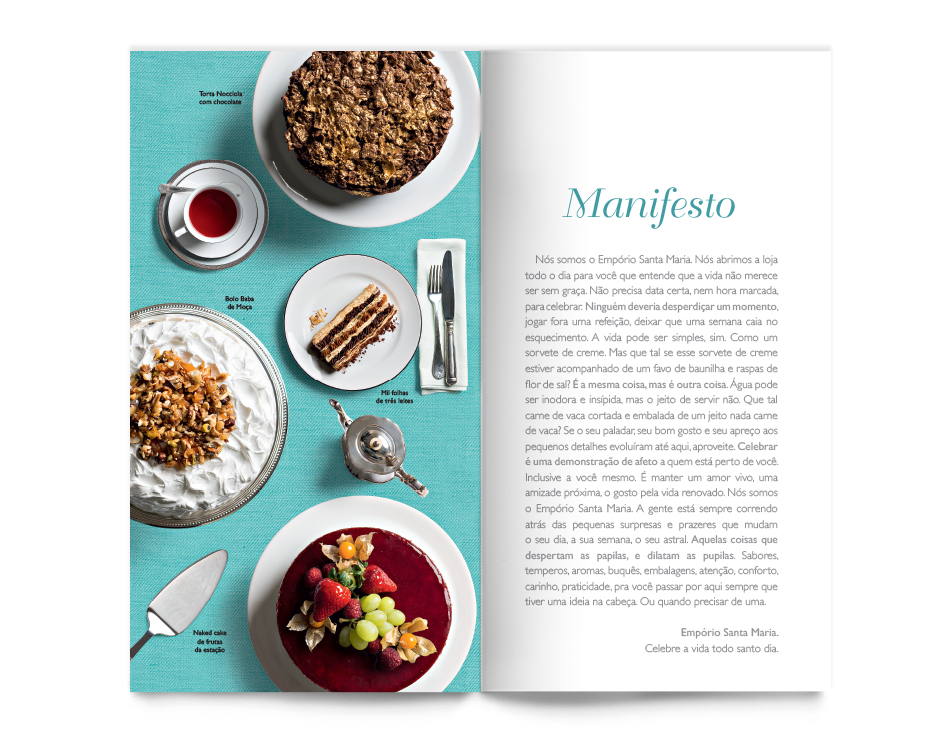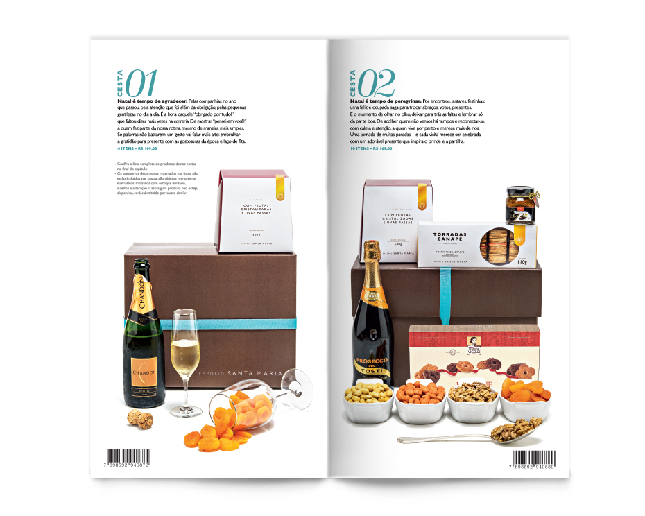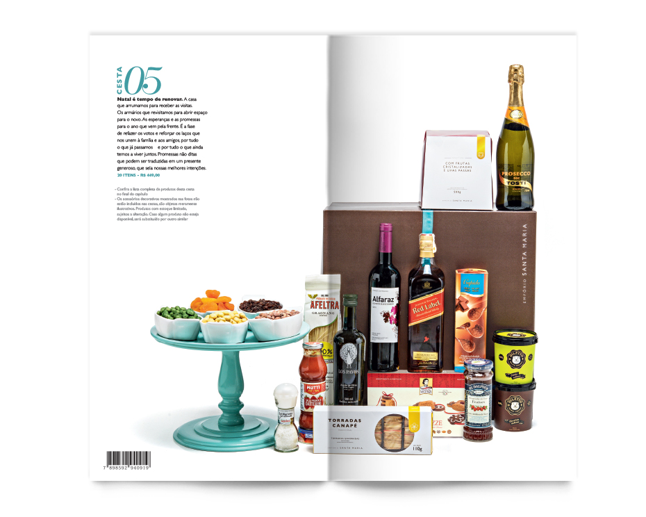 O Empório Santa Maria, do grupo St Marché, nos procurou para fazer o já tradicional catálogo de cestas e ceias de Natal. Sob o tema Clássicos e Básicos, fizemos o acompanhamento das fotos e o design das páginas. A sofisticação ficou por conta do pantone metálico azulado utilizado em todo o impresso.